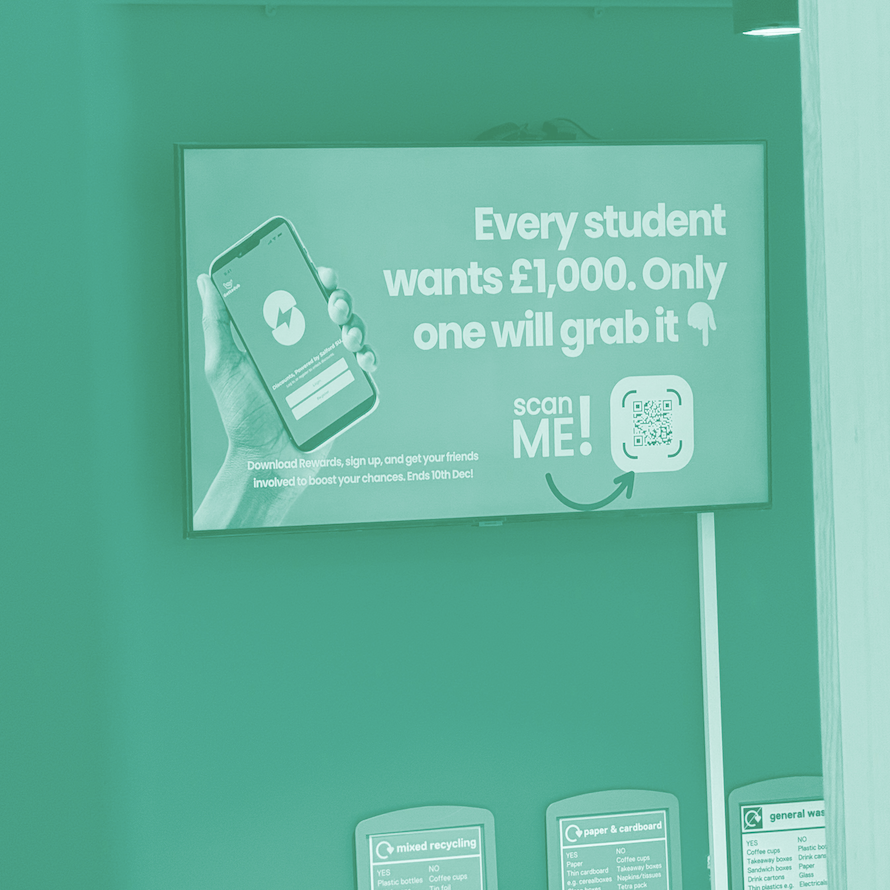 Digital screens get exposure from high footfall across campus. These work in a constant rolling format, and can be landscape photos, graphics or videos depending on your advertising needs.